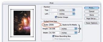 (Left) The File>Page Setup dialog set to 100%. (Right) The File>Print with Preview (File>Print in Photoshop CS3) dialog box set to 200%.