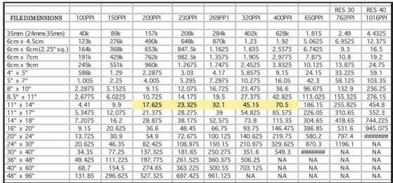 © Andrew DarlowThis resolution chart helps to determine appropriate file sizes for digital printing.