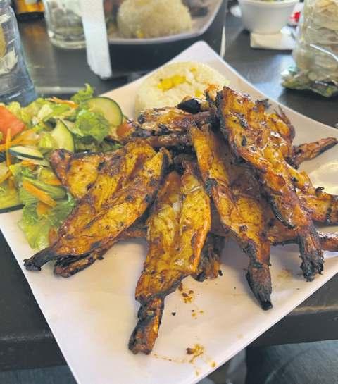 Seguimos con unos camarones sarandeados $320 son 500 gr los asan con madera de mezquite, que se siente el aroma desde que los presentan en mesa. Vienen con cáscara pero abiertos en mariposa, la verdad es la mejor manera de que tomen un gran sabor, porque si en algún lugar te los traen sin cáscara no tendrá un sabor para recordar, siempre pídelos con cáscara. Apilados en el plato vas tomando uno a uno y primero a sacar el jugo de su cabeza, para luego desprender toda su carne de un solo golpe con ayuda del tenedor y gozar de esos pequeños bordes quemados con sabor a madera y su salsa zarandeada, se acompaña con esa pequeña ensalada que les platicaba y el tradicional arroz blanco con elote amarillo.