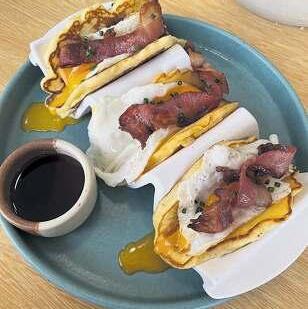 Cité a mi amigo Carlos a un desayuno de negocios decididos a tener un desayuno de campeones, ya que aquí, como buenos norteños, los platos son generosos como abrazos de los abuelos, que solo quieren dar amor. Iniciamos con El hot cake taco $170 es una oda al desayuno americano, con el twist propio de la chef, que presenta en un molde de taco, tres pequeños pancakes a los que en su base pone una rebanada de queso americano, monta un huevo, servido a tu preferencia, nosotros los pedimos estrellados, y una tira de tocino crujiente al que bañas con miel maple. Tomas con tus manos, cual taco pues, y experimenta lo mejor de los dos mundos culinarios; dulce y salado. Una verdadera explosión de sabor. Extraordinario platillo en concepción y ejecución.