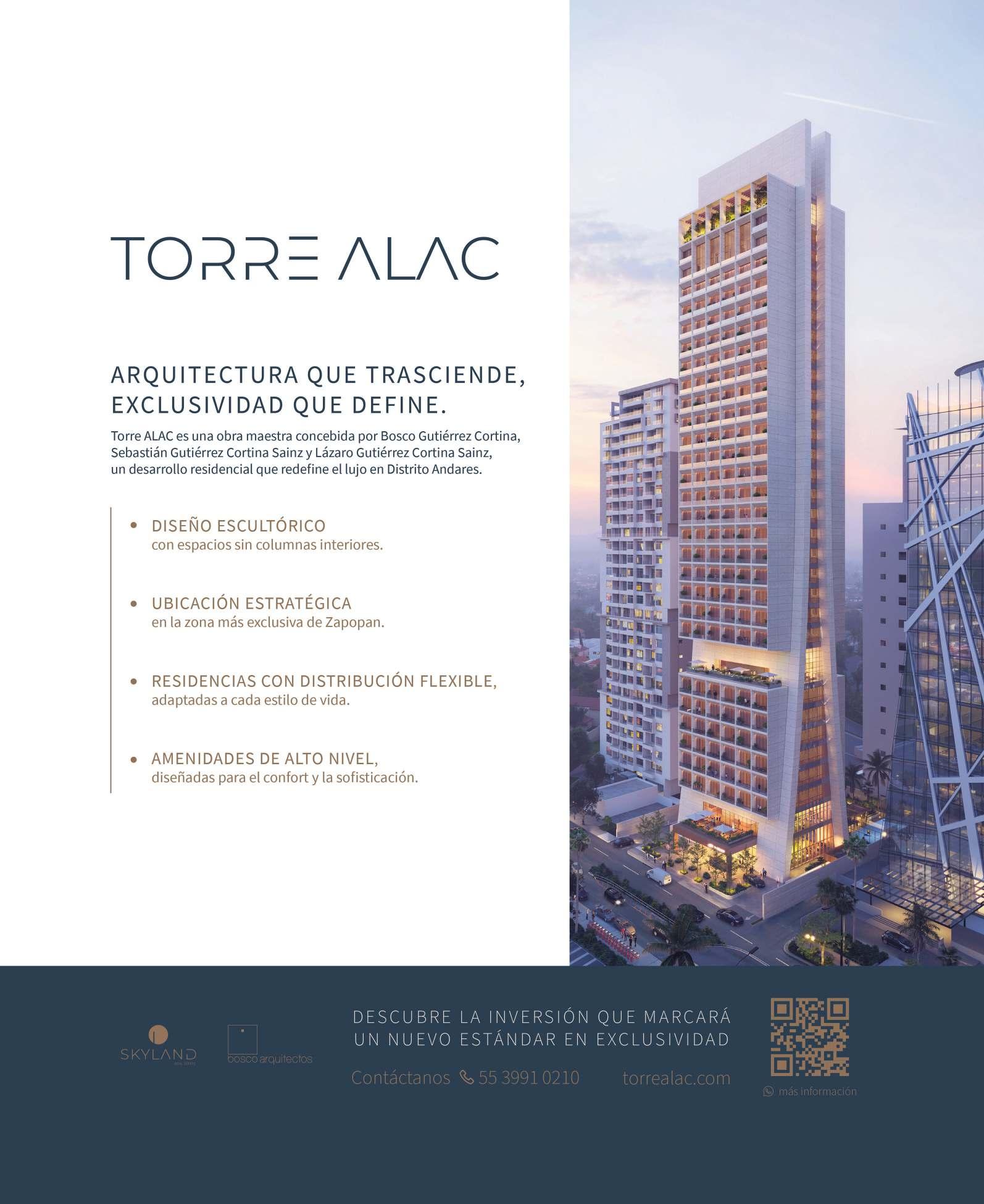 Diseñada y desarrollada por Skyland Real Estate y el despacho Bosco Arquitectos, bajo la visión de Bosco Gutiérrez Cortina, Sebastián Gutiérrez Cortina Sainz y Lázaro Gutiérrez Cortina Sainz, Torre ALAC es un referente en innovación arquitectónica que brinda una distribución flexible, ya que cada residencia ha sido concebida con un enfoque modular y personalizable, permitiendo adaptaciones según las necesidades de cada inversionista. Sin columnas interiores y con una optimización inteligente del espacio, los departamentos ofrecen una experiencia de lujo sin comprometer la funcionalidad de los espacios.
