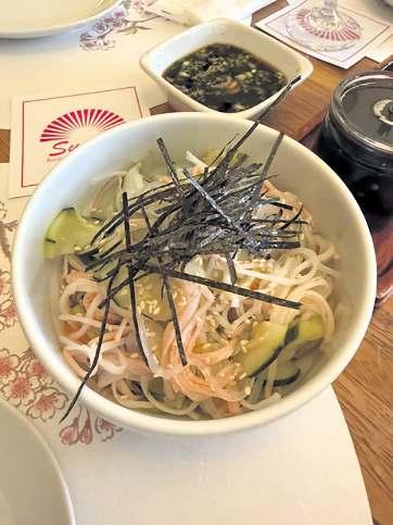 Por último y para hacer caso a la nutrióloga, ordenamos una Ensalada Orozco (otro gran cliente asiduo) $154 perfecta para iniciar o acabar la comida, y es que es muy fresca y de sabores suaves y dulces. Se prepara con fideos harusameque son más bien de origen chino, pero adoptados por la gastronomía nippona. Son elaborados de almidón de papa primordialmente, traslúcidos y de sabor muy suave. Los acompañan con pepino encurtido, surimo y coronan con alga en tiritas. Su aliño es de vinagre blanco con un poco de azúcar.