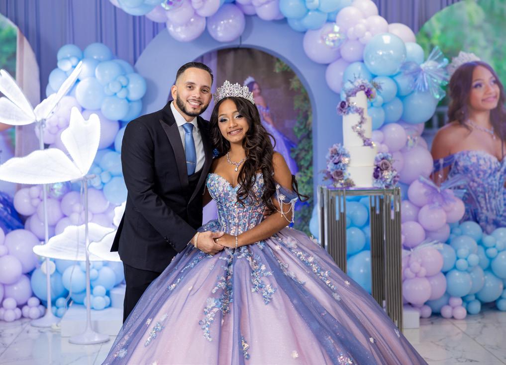 Keila’s lavender, light blue, and silver princess gown was the epitome of elegance and youthfulness. With a detailed floral corset, off-the shoulder sleeves adorned with pearls and crystals, a layered tulle skirt, and sparkling accessories, she looked every bit the princess of the night radiant, sophisticated, and unforgettable.