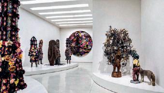 Elaboradas instalaciones y obras textiles son la marca del artista estadounidense Nick Cave (1959) –no confundir con su compatriota homónimo, dedicado a la música y a la poesía–. Las secciones temáticas de esta muestra se titulan Lo que fue, Lo que es y Lo que será. La primera de ellas explora piezas tempranas , influenciadas por el colectivo ParliamentFunkadelic de George Clinton. La segunda aborda la opresión, la pérdida, el duelo y el recuerdo, pero también la