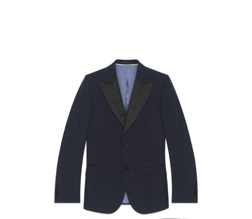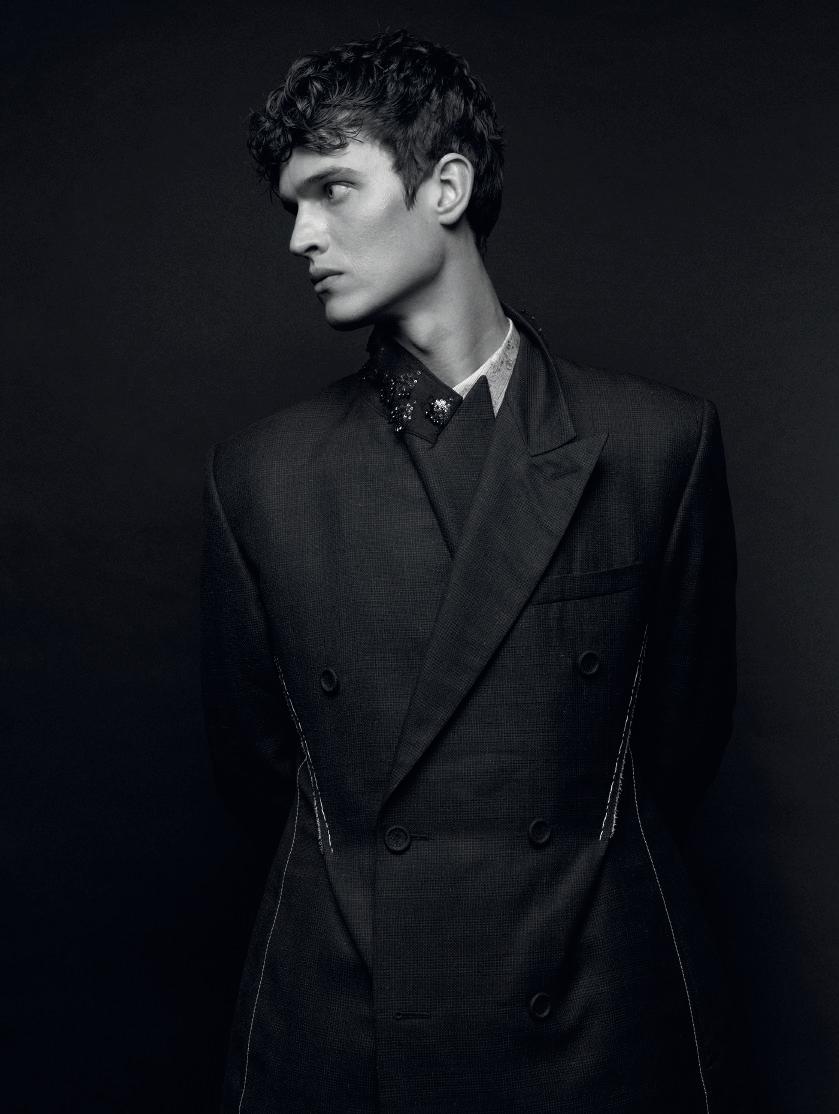 Abrigo cruzado en mezcla de lana y mohair con solapas bordadas y camisa oversize en tafetán de seda. Todo de Dior Men.