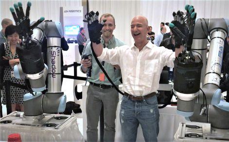 El CEO de Amazon utilizando un par de brazos robóticos durante la conferencia anual re:MARS donde se presentan desarrollos relacionados al espacio, los robots y la Inteligencia Artificial.