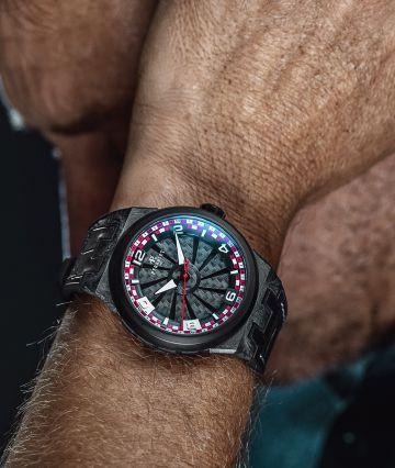 Por otra parte y en continuidad con el uso de materiales como la fibra de carbono, Perrelet presenta Turbine Carbon Racing que nos traslada al veloz mundo del auto motor, ya que desde la carátula se pueden apreciar los colores de los veloces cir cuitos, como la bandera a cuadros blanca y negra que ondea al final de la carrera o la bandera roja que indica la suspensión de la misma. Precisar que este reloj al estar construido con fibra de carbono es sumamente ligero, tal como sucede con los autos pro fesionales en la pista. Este guardatiempos se entrega en una caja táctica con correa de goma adicional y herramienta.
