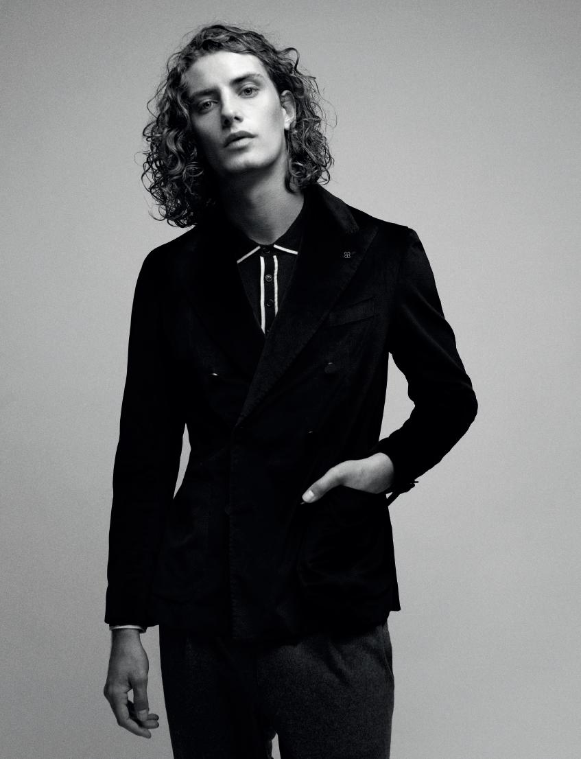 Saco de terciopelo y pantalones de algodón stretch. Todo de Tagliatore. Polo de punto de seda con perfiles blancos en contraste, Lorenzoni.