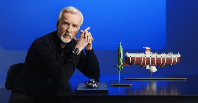 Cameron y un Oyster Perpetual Deepsea Challenge en su muñeca, posando con una maqueta de los sumergibles Trieste (derecha) y Deepsea Challenger DEEPSEA CHALLENGER (izquierda) los dos relojes experimentales acoplados a los vehículos durante las inmersiones en la Fosa de las Marianas respectivamente, el Deep Sea Special (detrás) y el Rolex Deepsea Challenge (delante).
