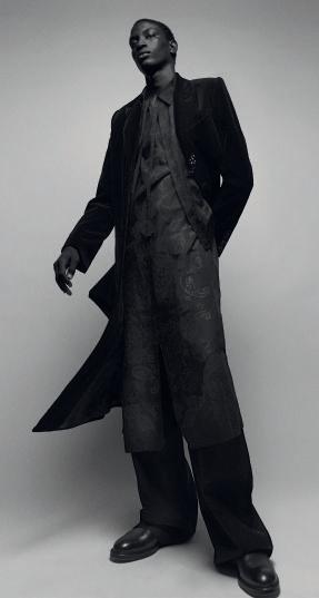 Abrigo largo de terciopelo con broche, camisa de seda arriba de un caftán con estampado floral y pantalones con pinzas de lana. Todo de Louis Vuitton. Botines de piel, Doucal’s.