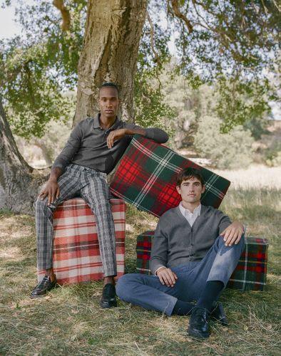 A la izquierda, esmoquin de terciopelo acanalado de algodón con saco de doble botonadura y solapa tipo chal, Brunello Cucinelli; suéter de punto de seda, Lorenzoni. A la derecha, peacoat de lana y cachemira con cuello redondo, suéter y pantalones de lana elástica. Todo de Canali.