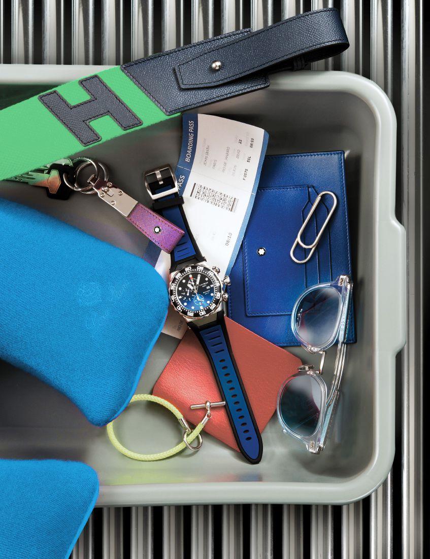 Piana, cinturón y brazalete Hermès, cartera de piel Fontana Milano 1915, tarjetero de piel y llavero de mezclilla, todos de Montblanc; Cronógrafo Locman Sea 300 Meters, gafas de sol Prada Eyewear, clip de dinero Larusmiani.