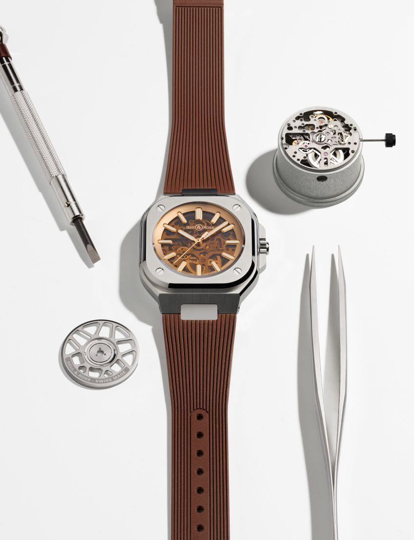 Como lo mencionamos, una de las principales características de BR 05 es la construcción arquitectónica de su caja, donde confluye una línea circular al interior de un cuadrado y donde se incorpora un cristal de zafiro sujetado inteligentemente por cuatro tornillos pulidos que, también, refuerzan la estructura de la caja de acero,