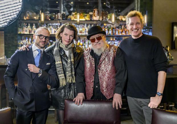 En el sentido de las manecillas del reloj: Leonardo Laviola, presidente Blancpain Norteamérica y Country manager prestige brands, Milla Jovovich, George R.R. Martin y Paul W.S. Anderson. El exterior de Jean Cocteau Cinema y el cartel