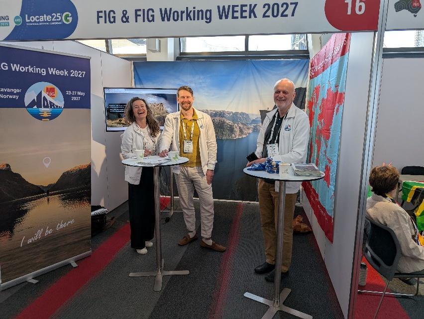 Guro Voss Gabrielsen frå Kommunal- og distriktsdepartementet (KDD) Leif Ingholm frå Samfunnsutviklerne og Terje Midtbø frå Geoforum på den norske standen for å promotere FIG WW i Stavanger 2027. Foto: Kirsten Cox