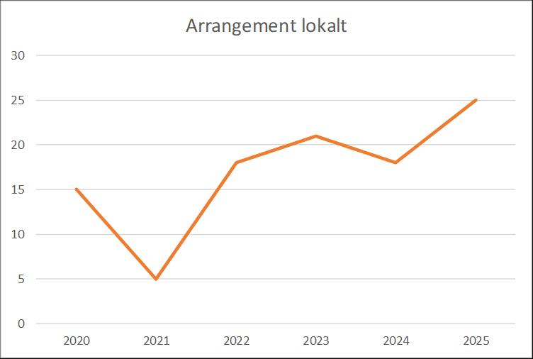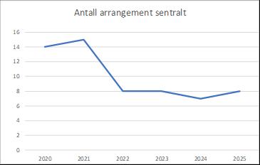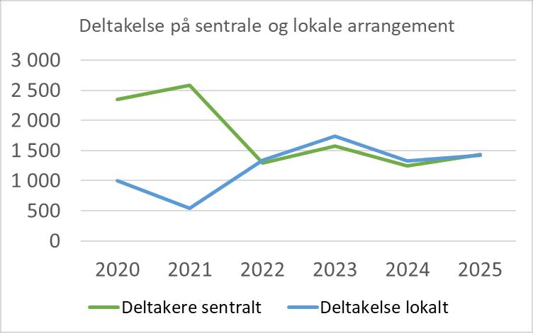 Mens det i før covid, var flere som deltok på lokale arrangement, er det tilnærmet lik deltakelse lokalt og sentralt. Sentralt har det vært færre arrangement fra 2022.