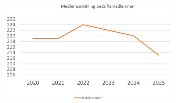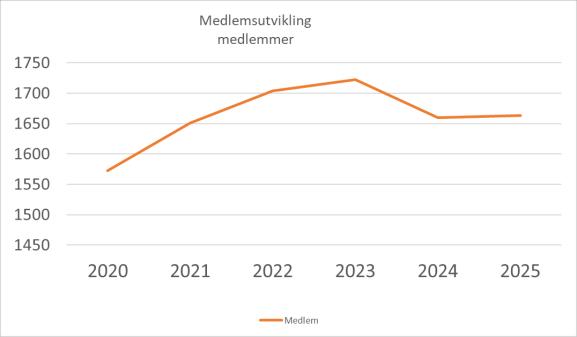 Totalt er dette en nedgang med 14, en økning med 2 medlemmer og nedgang med 7 bedriftsmedlemmer i 2025 (Medlemstall i 2024 var totalt 1 881, herav 1 661 medlemmer, 220 bedriftsmedlemmer)