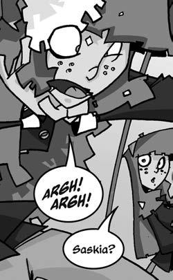Saskia olhou para o chão e engoliu o riso em sua garganta como a um sapo. As lágrimas começaram a rolar lentamente por suas bochechas brancas e seus lábios passaram a tremer, enquanto lutava para segurar o riso. Pensando que Saskia estava prestes a chorar, senhorita Rimmer lançou-lhe um olhar de desdém enquanto saía da sala, resmungando baixinho.