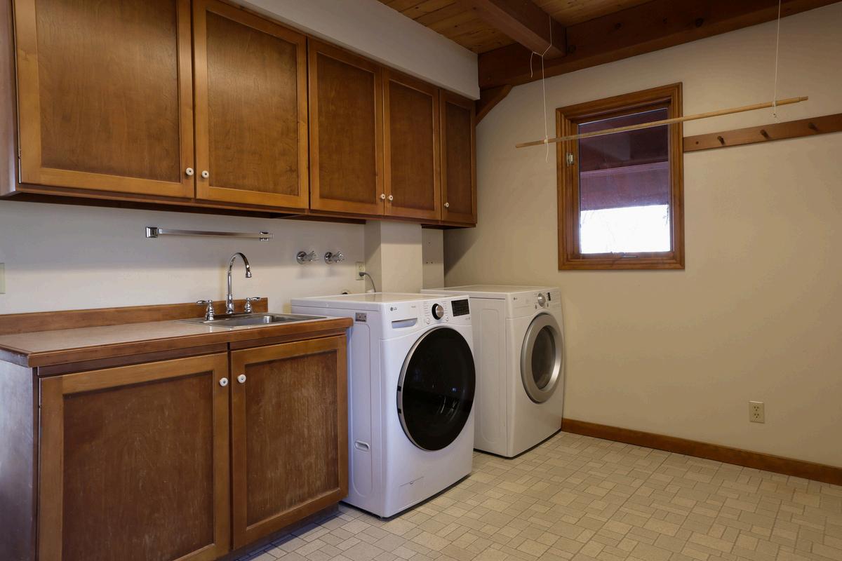 This utility room opens to the garage and kitchen. It has connections for a washer and dryer, room for a freezer or refrigerator, and space for pantry shelves. It has plenty of cabinet storage.