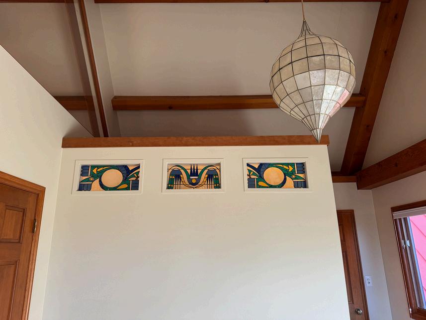 Three cabinet doors have decorative leaded glass.