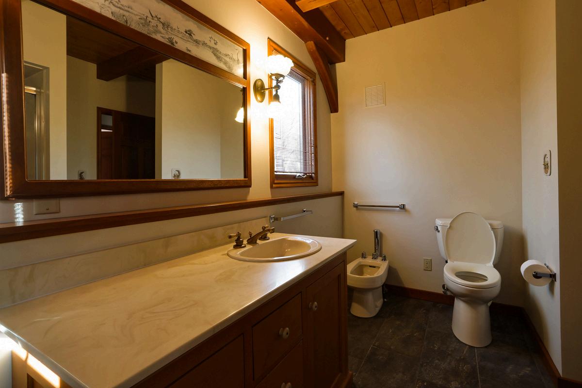 The main floor bathroom has a slate tile floor, a bidet, traditional toilet, and a large shower.