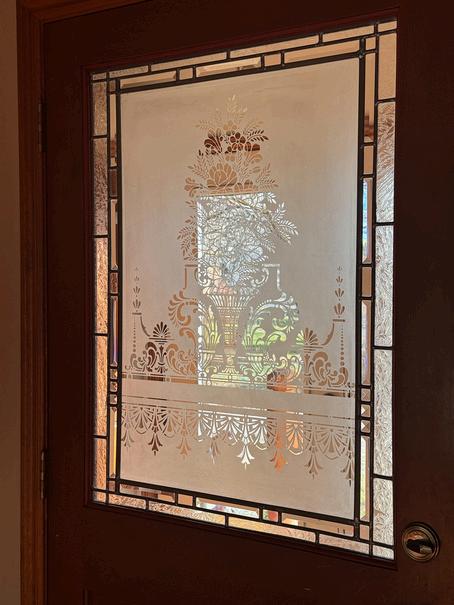 Etched glass decorates the door leading to the front entranceway.