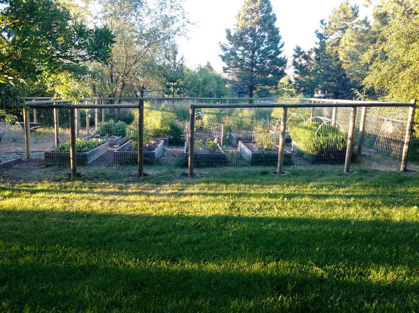 The fenced-in garden space protects the 12 raised beds from deer. Next to the garden is a separate fenced-in dog run.