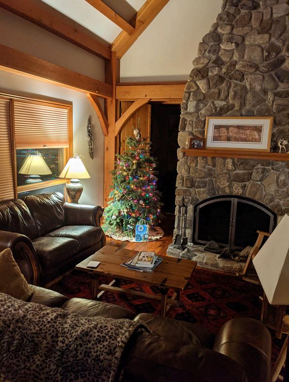 This sunny room is on the west side of the house on the main floor and has a large, two-panel, wooden door (in addition to the main door) that can be opened to the rest of the main floor space. (Note the open door behind the Christmas tree on the preceding page).