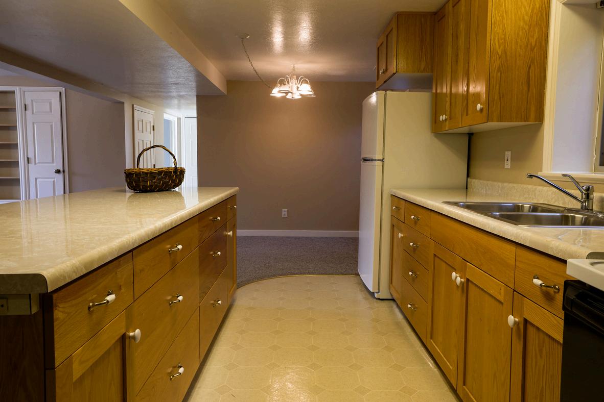 The lower-level kitchen with integrated breakfast counter/storage.