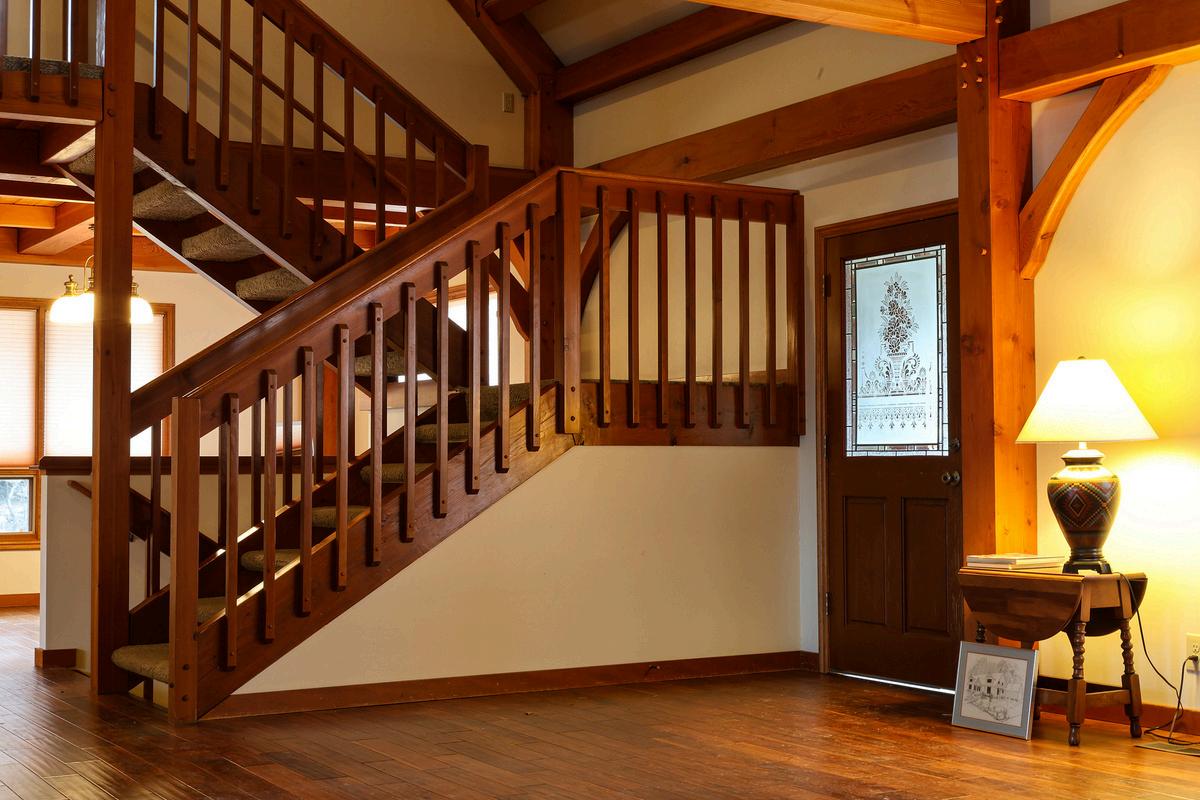 A hallmark of timber frame* (TF) houses is the use of traditional, mortise-and-tenon craftsmanship (interlocking wood joints secured with wooden pegs). These allwood connections not only create unique aesthetic appeal, but they also result in exceptional longevity, strength against seismic activity, high storm durability, lower insurance rates, and lower long-term maintenance costs relative to traditional stick frame (SF) houses. TF homes are also typically much more energy efficient than SF homes because they often use, as ours does, structural insulated panels (SIPs) in the walls, which are less ‘leaky’ than SF homes. Our monthly electric and gas bills were much lower than the average for similar sized homes in Providence.