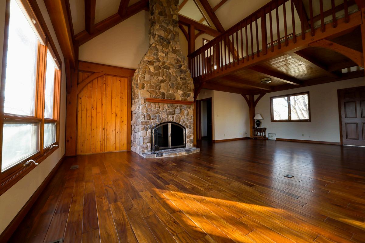 Beautiful living room features a working fireplace built from native stones excavated from the basement space when the house was built.