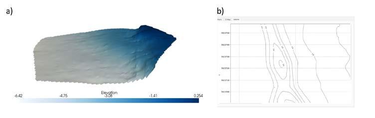 with the echogram (Figure 5). Vegetation and loose rocks are easily identified in the echogram. These comparisons contribute to a better understanding and, at the processing stage, ensure that no structure that may represent a risk to the operation and navigation is removed.