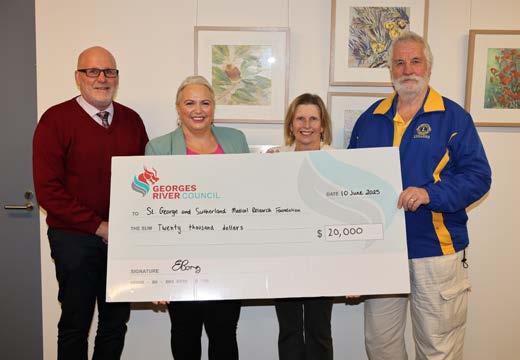 Image: (L-R) Georges River Council General Manager David Tuxford and Mayor Elise Borg, presenting the cheque to Pam Brown from the St George and Sutherland Medical Research Foundation, and Reg Walker from Lions Club of Lugarno.