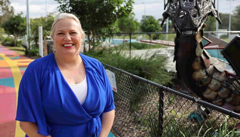 Below: Artist Merindah Funnell with her Where Waters Meet Mural in Kogarah Town Square.