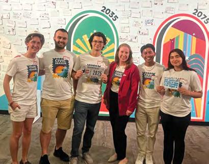 Caroline Klibanoff and her Civil Season team—including fellow Hoyas Joseph “Scottie” Vandy (C’27) and Wyatt Nako (C’26)—celebrate the U.S. 250th celebration in front of the Wish Wall mural at the Smithsonian’s National Museum of American History.