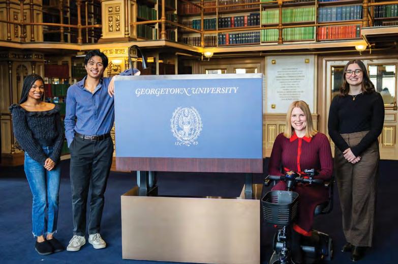 “Lecterns are not one size fits all,” says Amy Kenny, director of the Disability Cultural Center. Kenny, who uses a mobility scooter, found her view was often obstructed behind a lectern when presenting. Michael Pasimio (SFS’22, G’26) and Sarah Craig (SFS’23, G’26), pictured here with Chloe Smith (N’26) (far left) and Amy Kenny (seated), used skills from Georgetown’s Learning, Design, and Technology program to design an accessible, adjustable lectern that is now being used in Riggs Library.