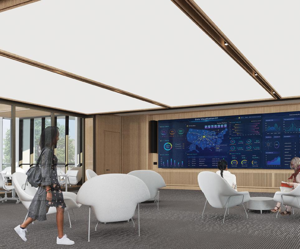 A centerpiece of this space, the Visualization and Learning Lab, will feature the university’s first openly accessible large-format, high-resolution display wall, enabling students, faculty, and alumni to analyze and present data-rich and other visually mediated forms of scholarship. The virtually soundproof lab will be available for small classes, seminars, collaborative group work, digital exhibitions, and large presentations.