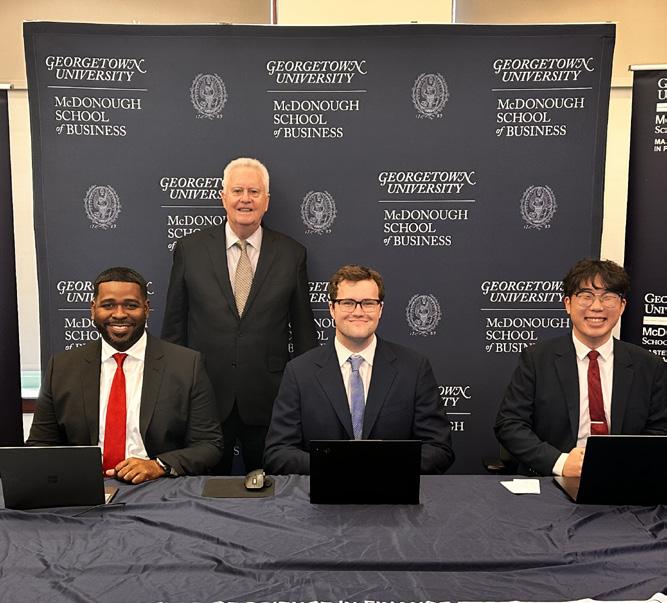 The ability to apply knowledge gained in the classroom to real-world projects and business problems is critical in today’s marketplace. Graduates of the Georgetown MSF program have ample opportunities — both through embedded team-based projects and optional internshiplike experiences. By graduation, all students participate in a week-long team-based investment competition and a six-week global consulting project capstone that pairs teams with international clients and complex business problems to solve. In addition, students have the option of completing a formal internship or signature MSF Clinics program that pairs teams with businesses to address topics ranging from global pricing to valuation to AI integration. These six-week projects are offered during the winter and summer and engage alumni, current students, Executives in Residence, and others in complex problemsolving and executive presentations.