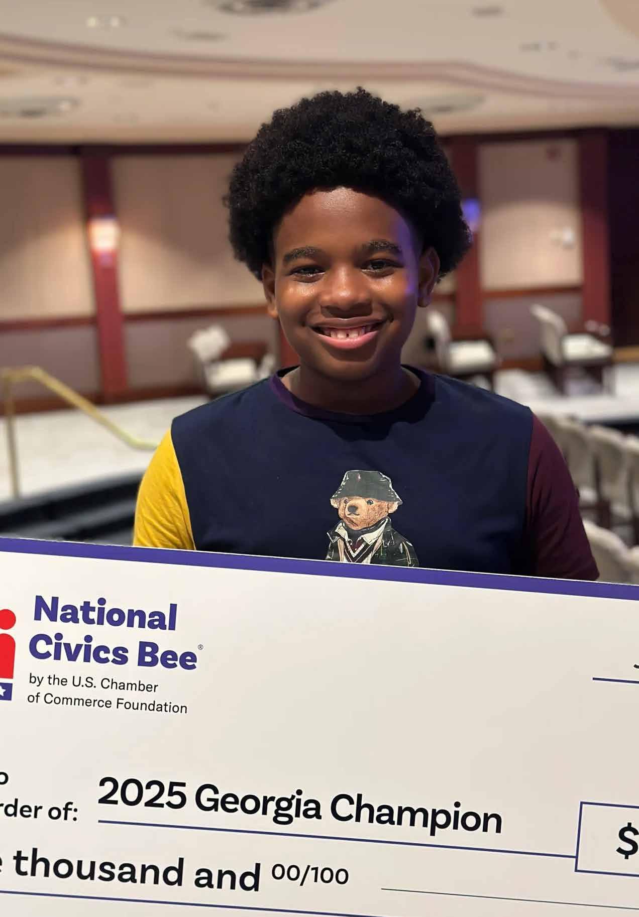 “ The Civics Bee is a really great way to get involved. It’s fun, and it’s a hands-on way to get involved in government. Kaden J. CHAMPION, 2025 GEORGIA STATE FINALS, THE NATIONAL CIVICS BEE ®