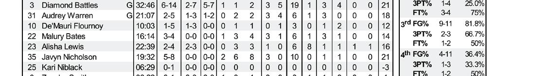 On Thursday, when she posted her career-high, Lewis said she enjoyed “every single one” of her dimes and credited her teammates for making the shots. She distributed to numerous players, too, as Warren, Battles, Malury Bates, Brittney Smith and Javyn Nicholson all scored off of feeds from Lewis. Seven of her assists came in the second quarter alone.