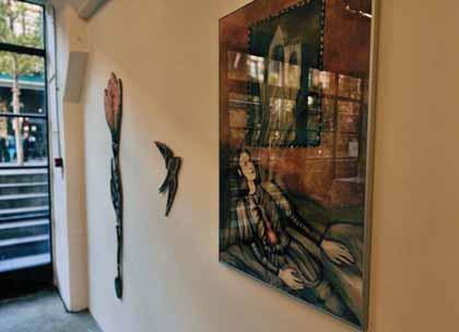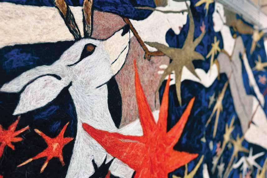 textile composition, dominated by a white deer-like figure, elongated and almost spectral, evokes a symbolic lexicon that feels at once folkloric and estranged. If Varazi’s contribution leans toward the surreal and the oneiric, Jishka-