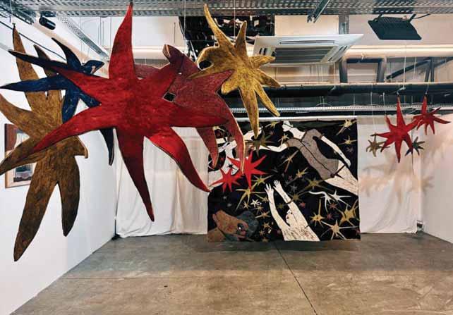 The first encounter is spatial rather than conceptual. Suspended forms, spiked, star-like, vaguely vegetal or perhaps microbial, hover in midair, their saturated reds, ochres, and bruised violets absorbing and diffusing light. They read as both decorative and faintly threatening, soft sculptures that retain the memory of touch even when untouched. Their tactility is not incidental; it is the