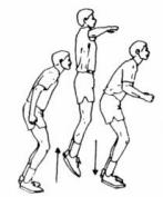 Saltar de la caja y caer sobre am-bos pies. Saltar explosivamente hacia arriba y hacia adelante, extendiendo los brazos para atrapar un pase del compañero en el punto más alto del salto