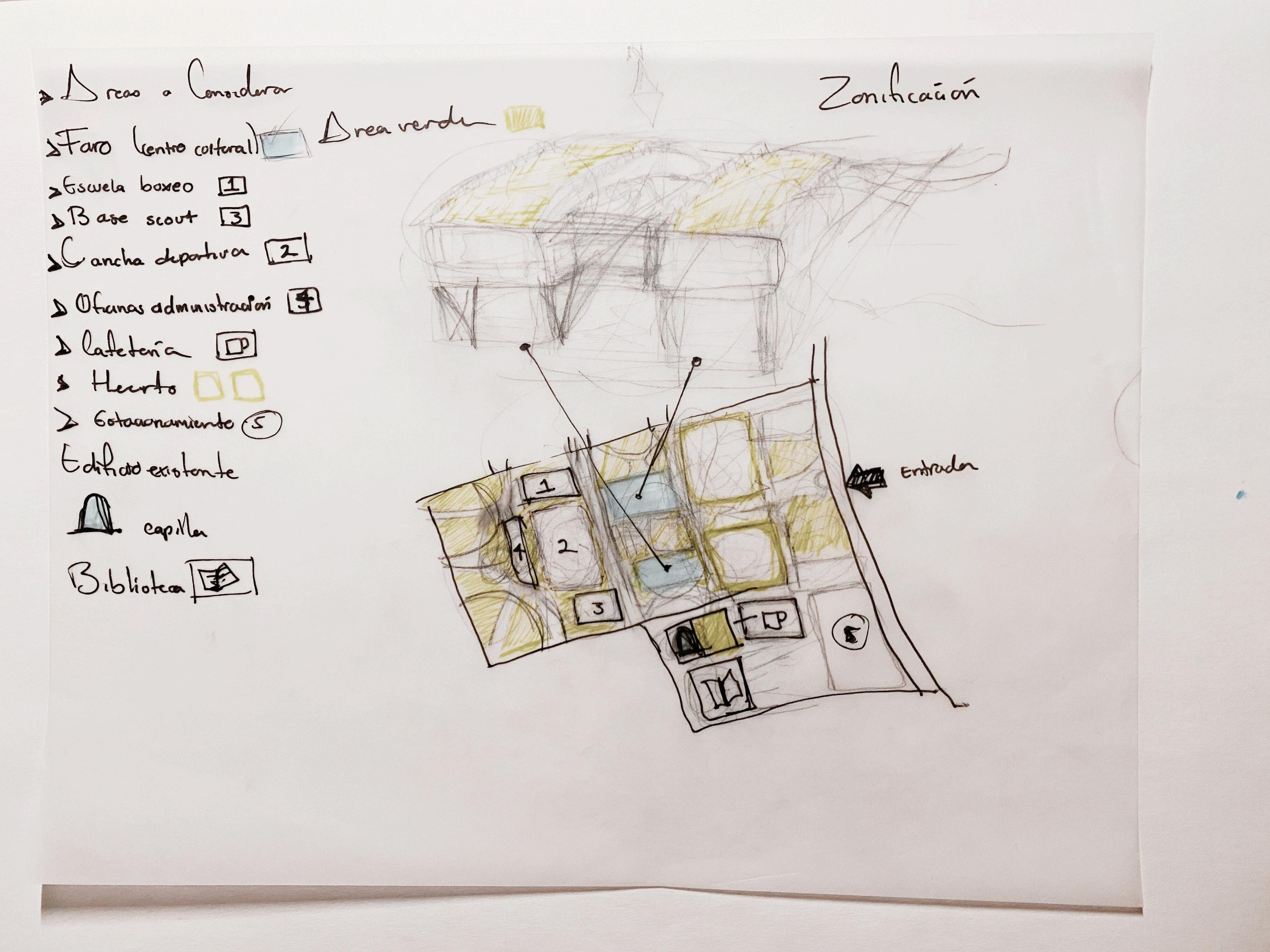 This scout base is thoughtfully designed to address the specific needs of the Yuguelito scout group, who have proudly championed their community on regional and national stages. The building comprises two volumes linked by a complementary roofing system: a smaller roof sheltering the enclosed spaces— restrooms, office, and storage—while a vast, angled roof, held aloft by "V" shaped columns, embraces the open-air gathering space.