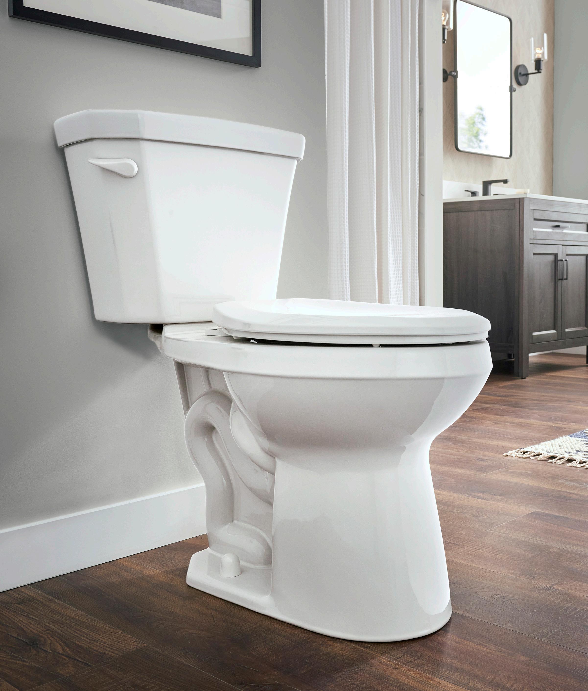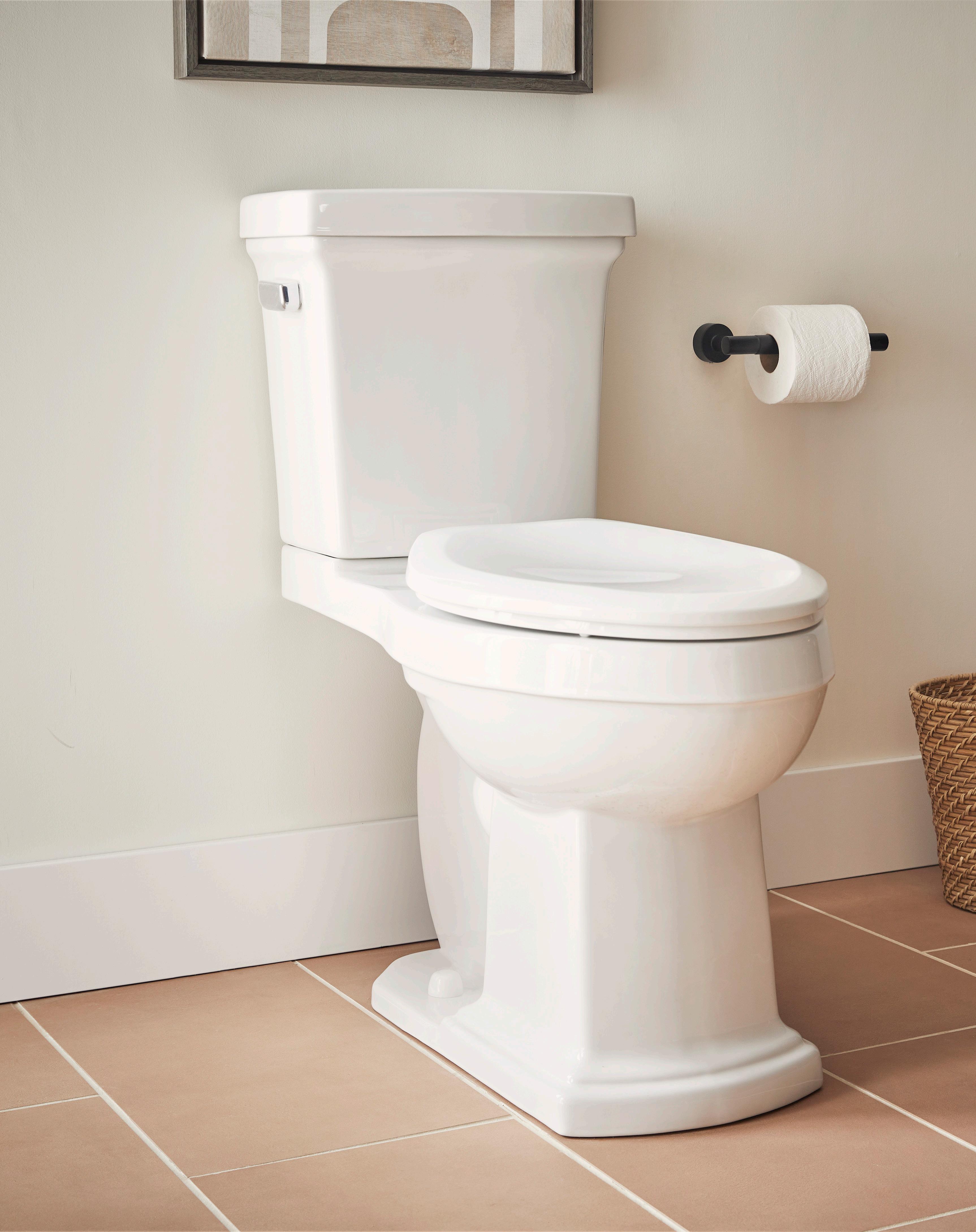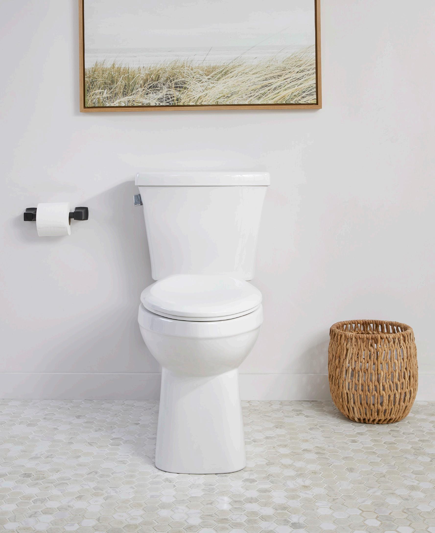 Page de gauche : Toilette deux pièces AvalancheMD à cuvette allongée ErgoHeightMC, plomberie brute de 12 po, 1,28 gpc/Blanc/ GWS31818