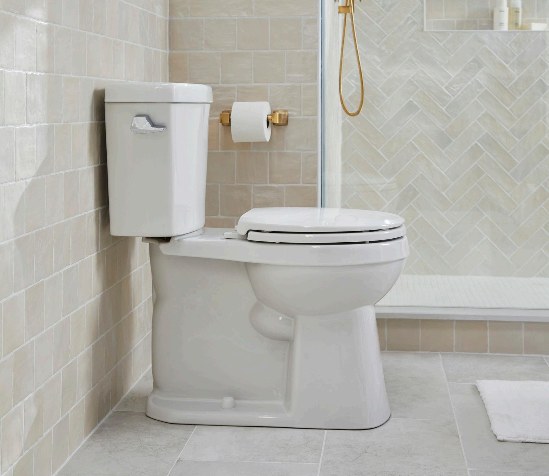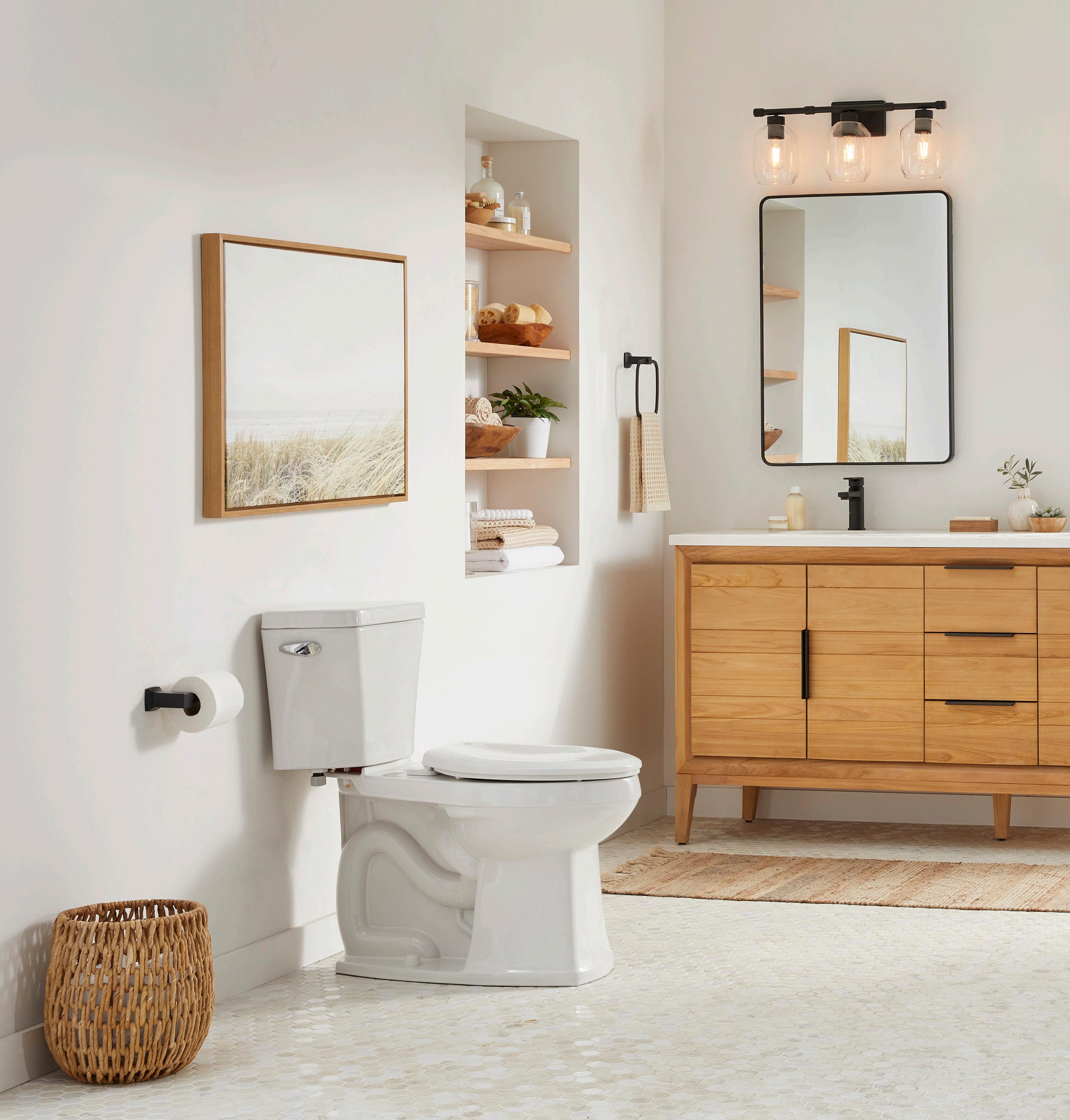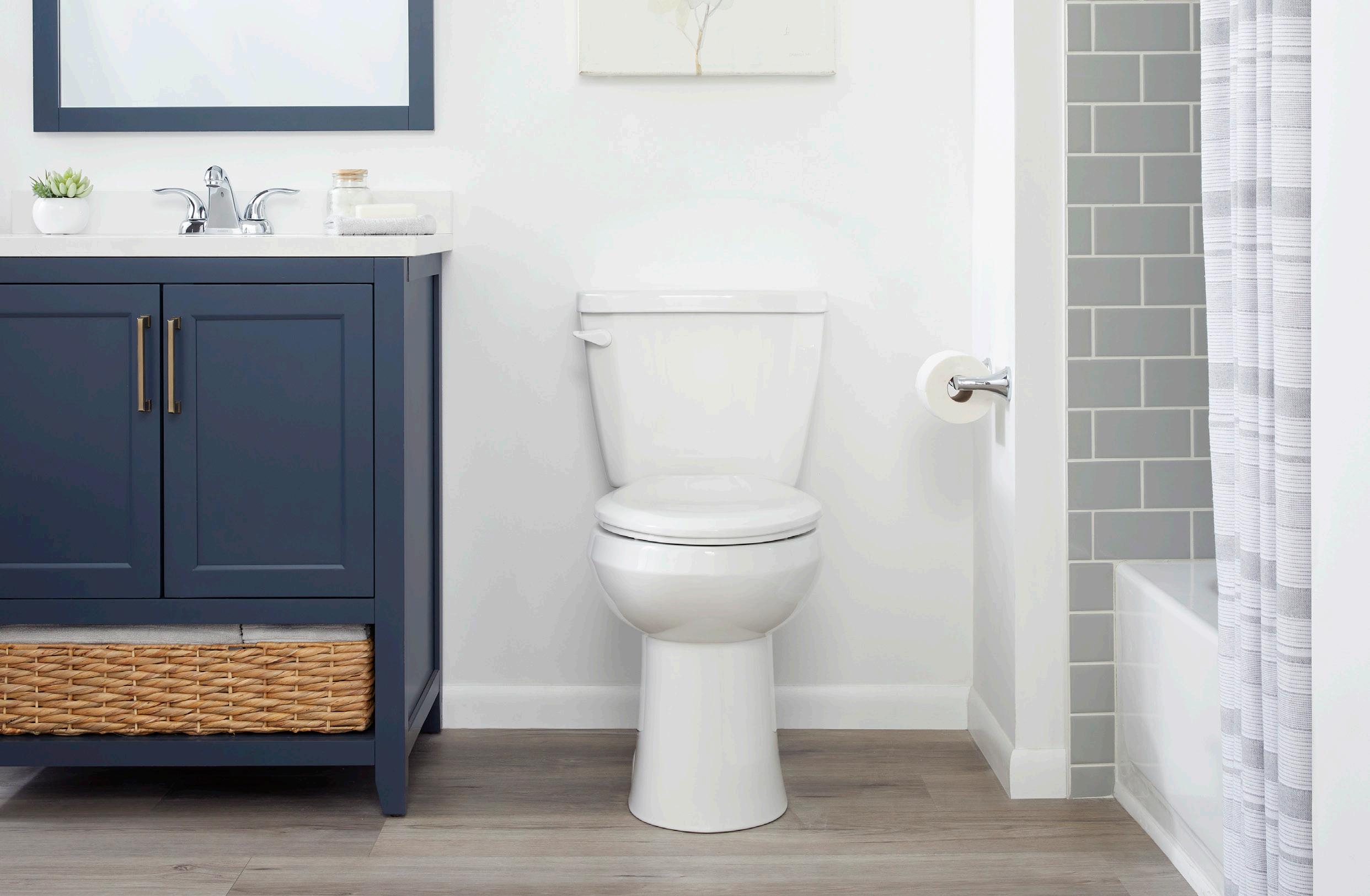 Page de gauche : Toilette deux pièces AvalancheMD à cuvette allongée ErgoHeightMC, plomberie brute de 12 po, 1,28 gpc/Blanc/ GWS31818