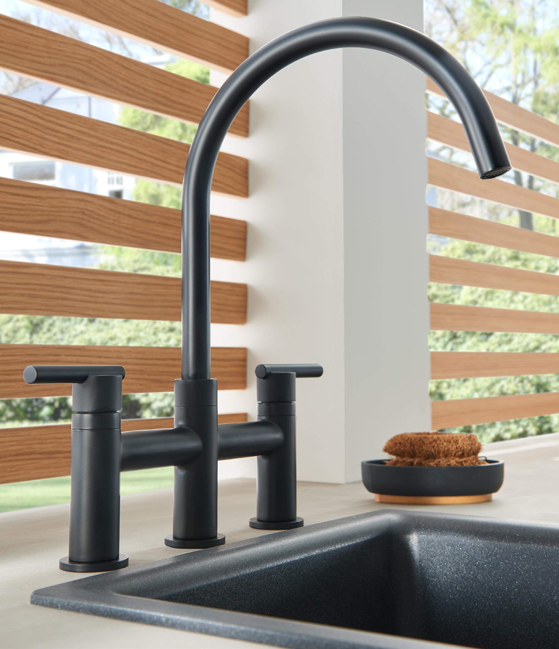 Page de gauche : Robinet de cuisine à pont KinzieMD à deux poignées à bec extensible/Noir satiné/D434437BS