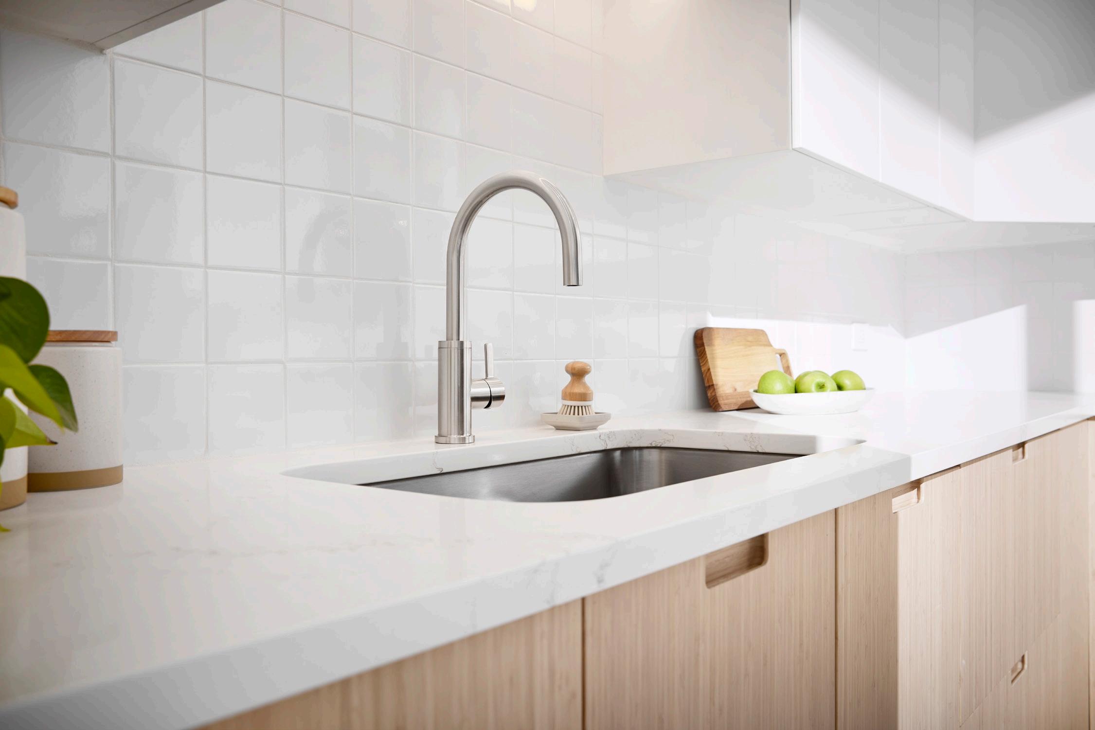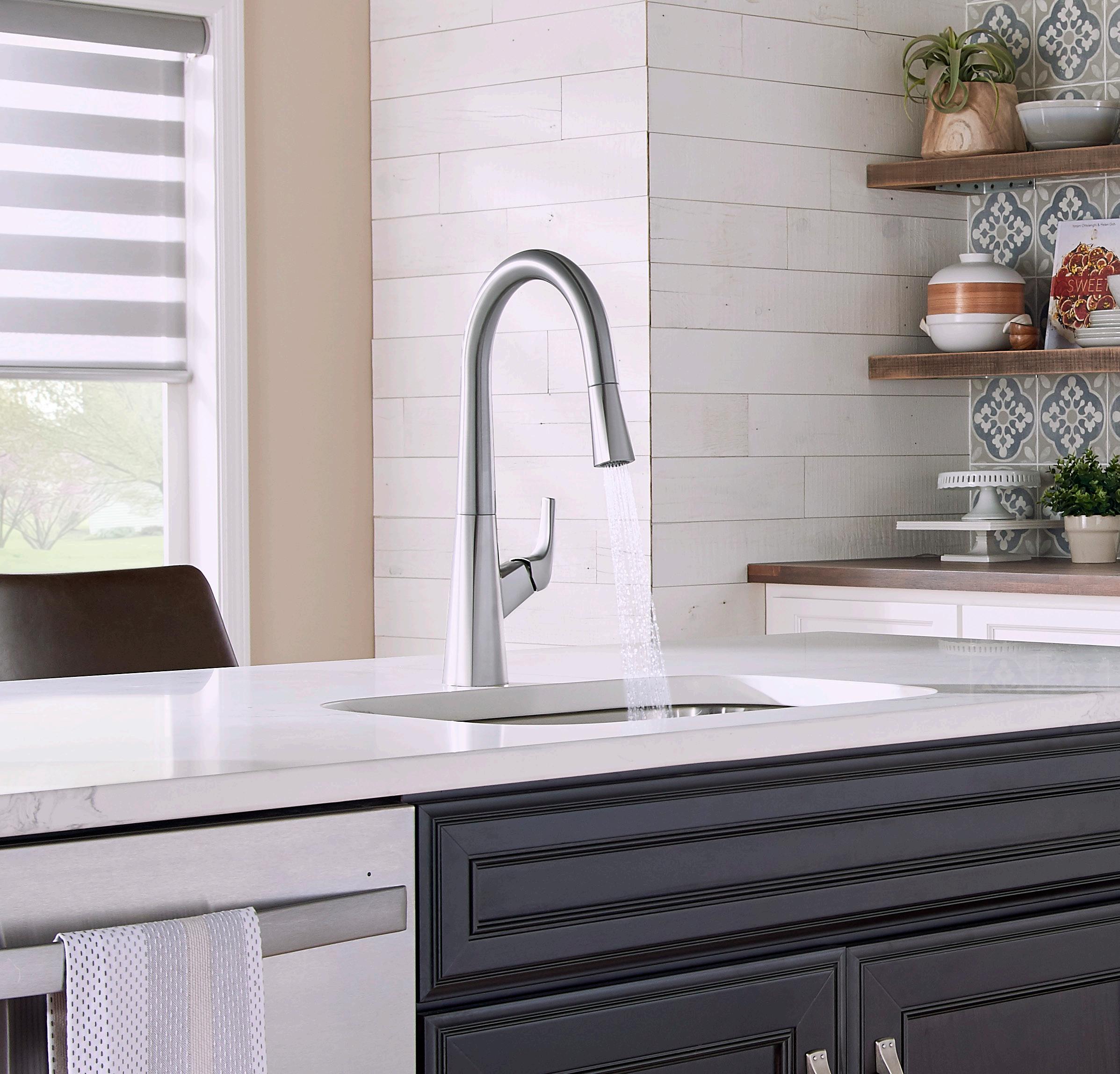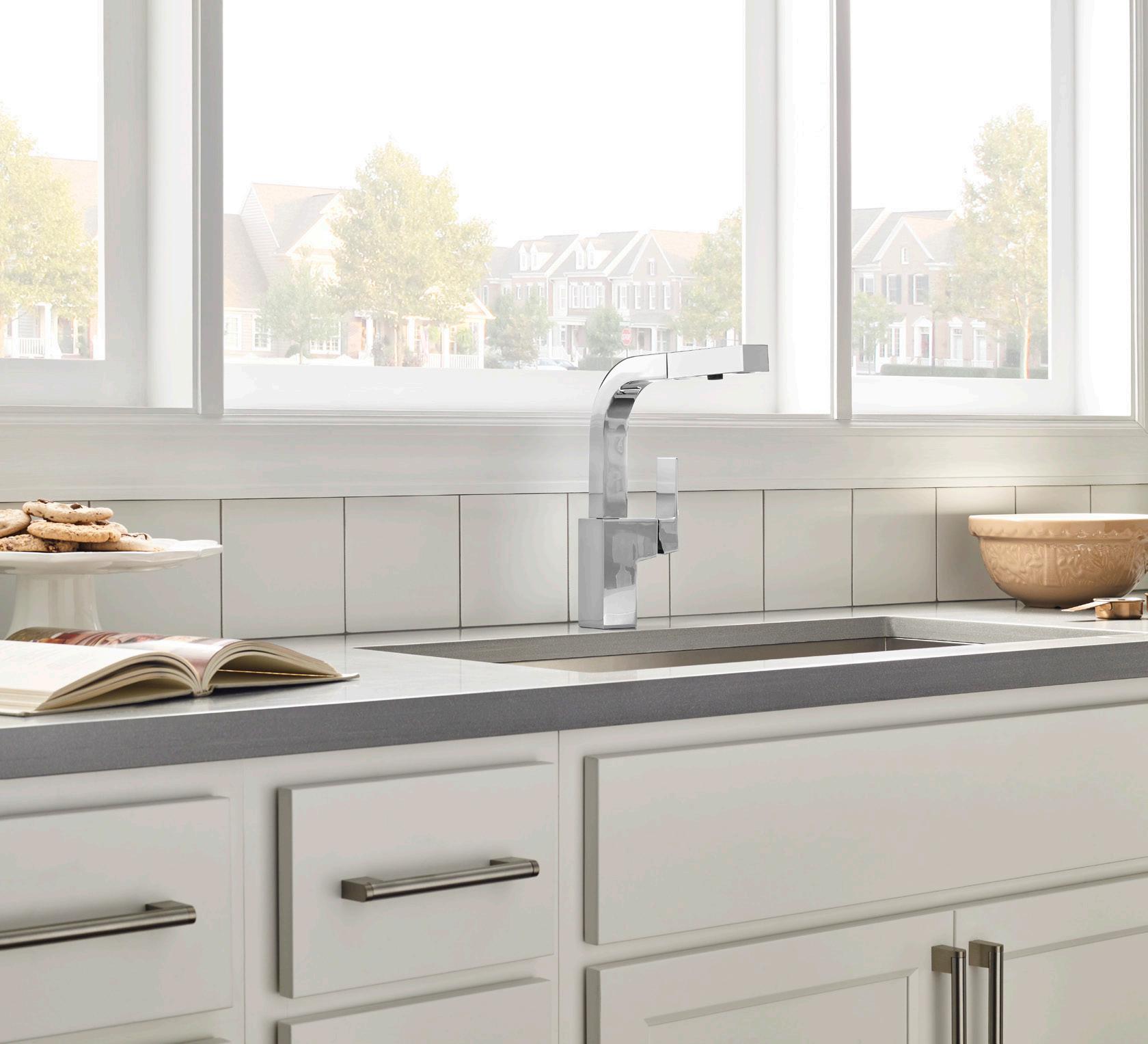 Le style transitionnel inspiré par la fluidité et le mouvement de la collection VaughnMD s’intègre parfaitement à n’importe quelle cuisine. Les courbes et les plans lisses du corps du robinet lui confèrent un style intriguant grâce au contraste avec sa poignée en angle.
