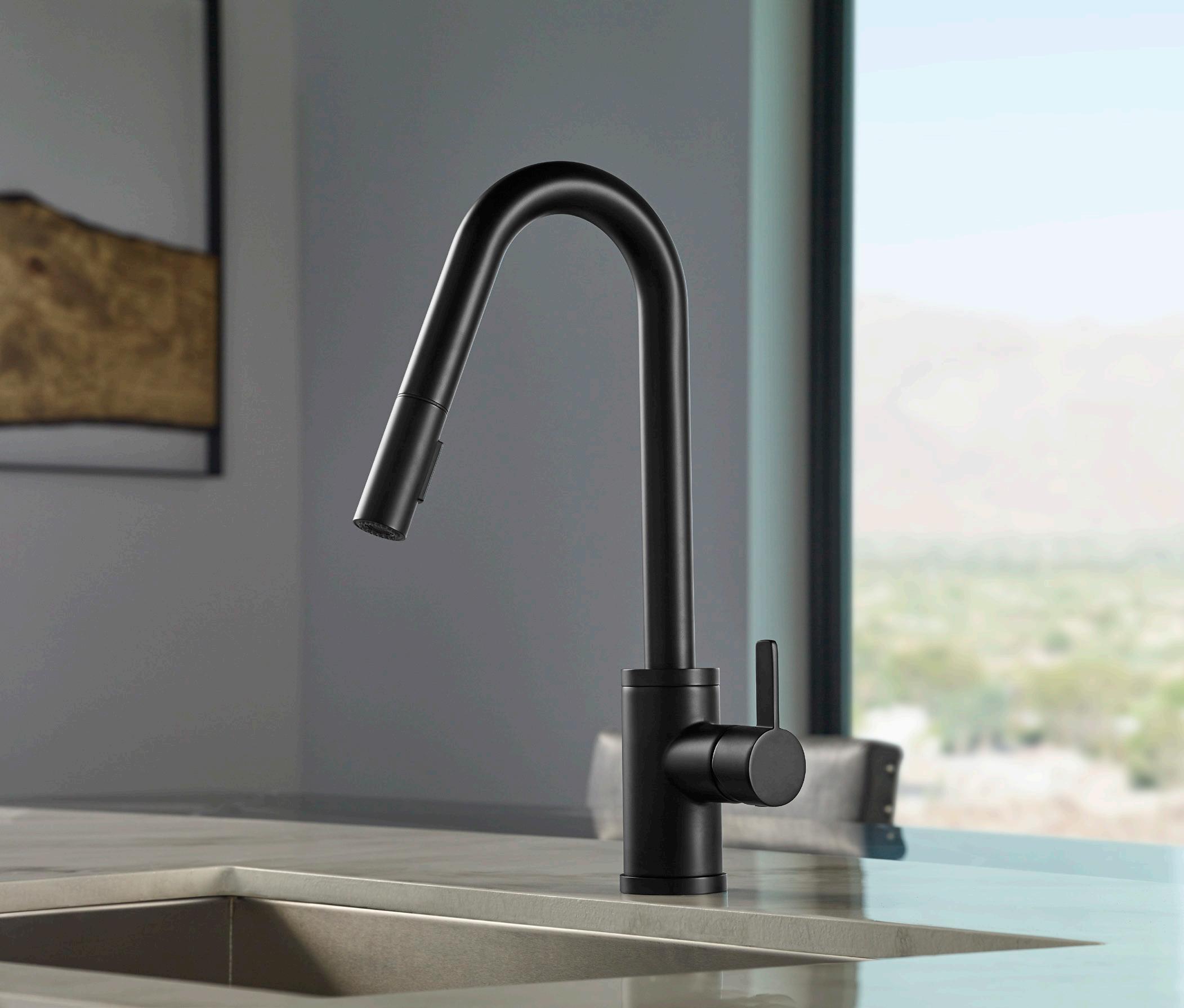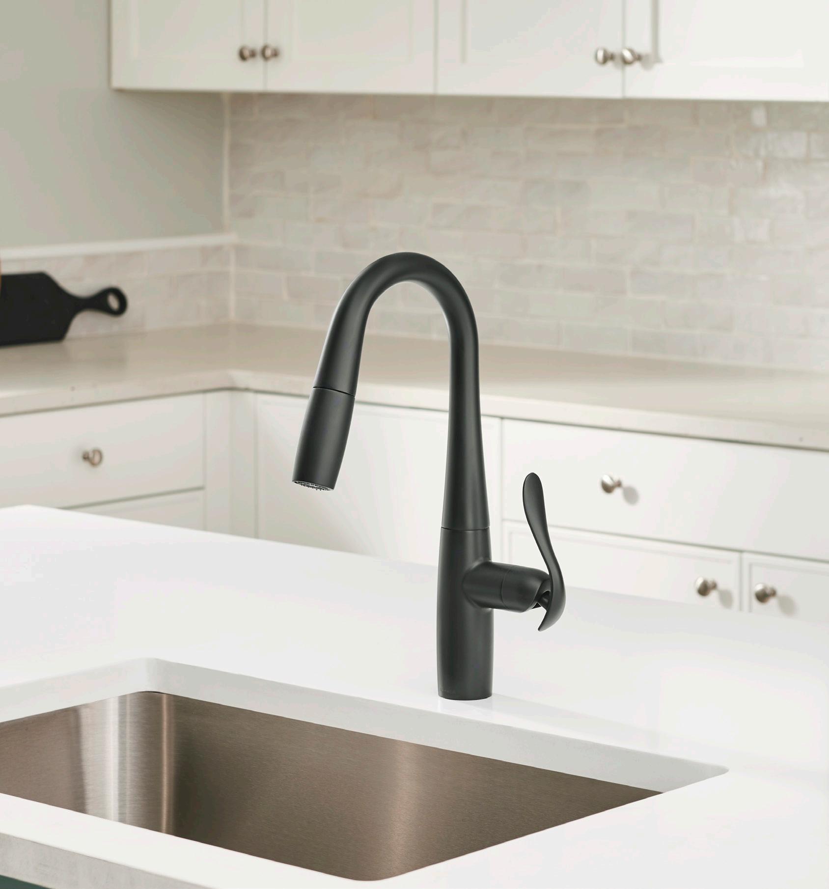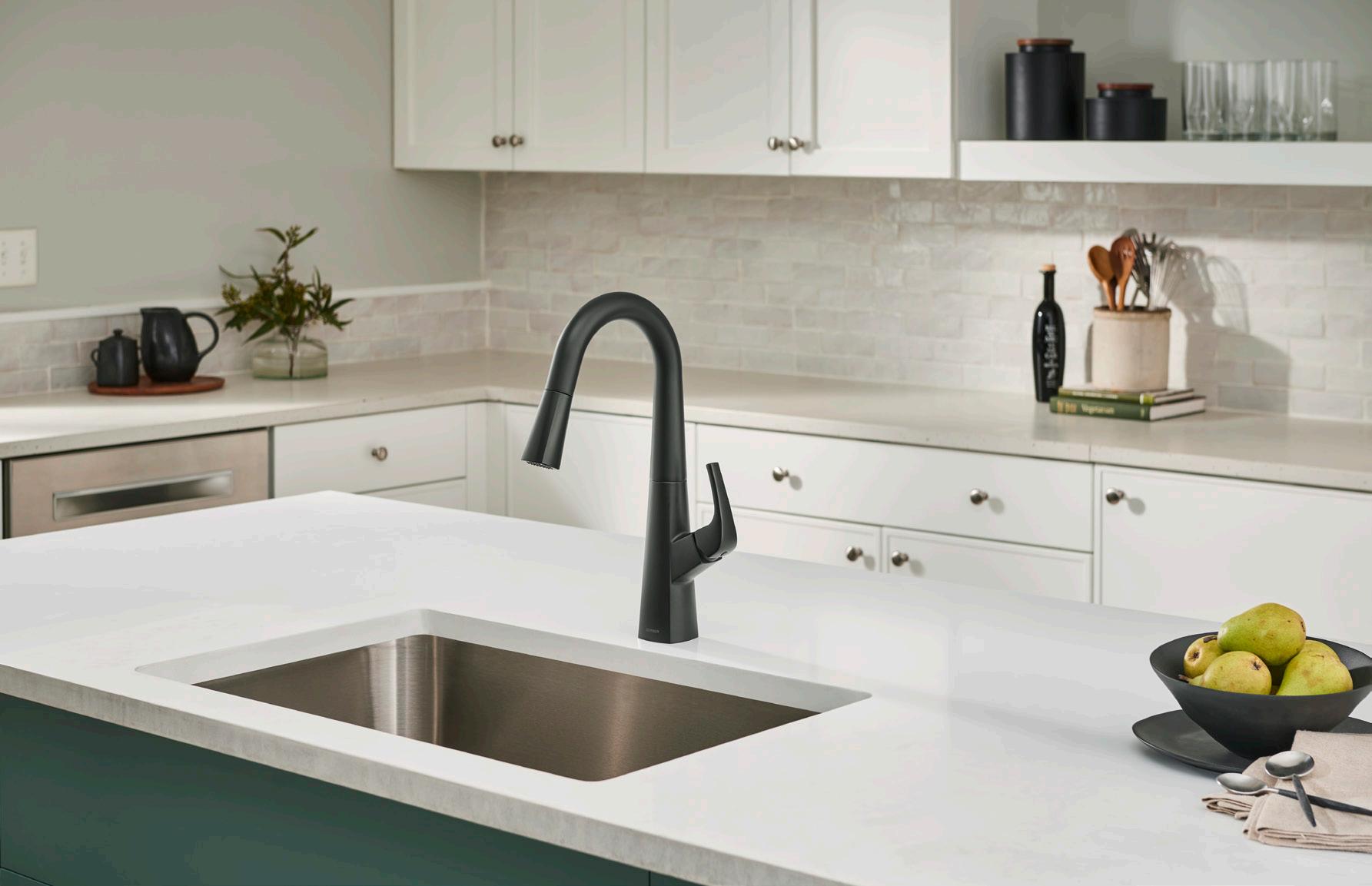 Page de gauche, image du haut : Robinet de cuisine OpulenceMD à une seule poignée à bec extensible/Noir satiné/D454057BS