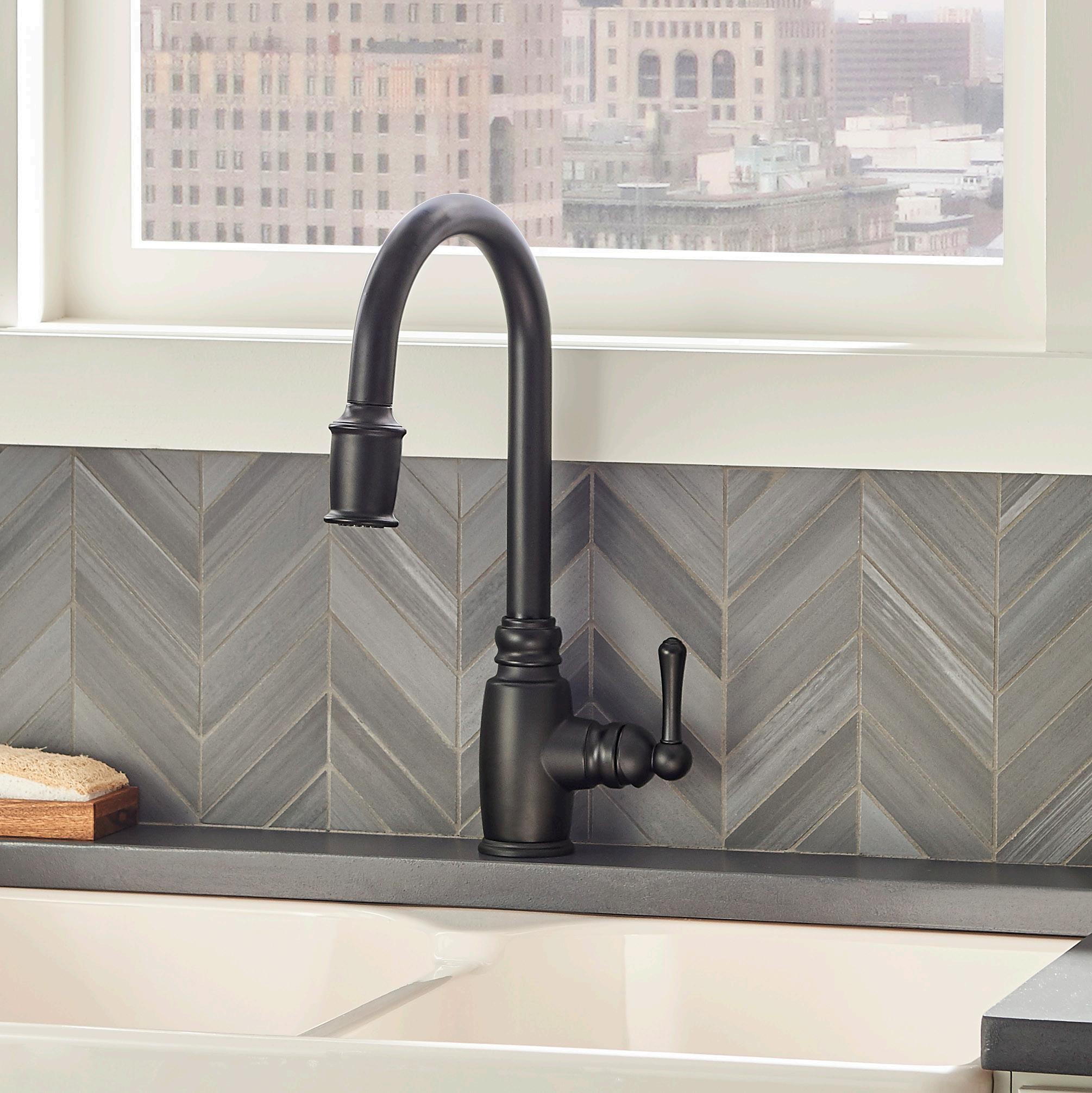 Cette page : Robinet de cuisine KinzieMD à une seule poignée à bec extensible/Bronze brossé/D454437BB
